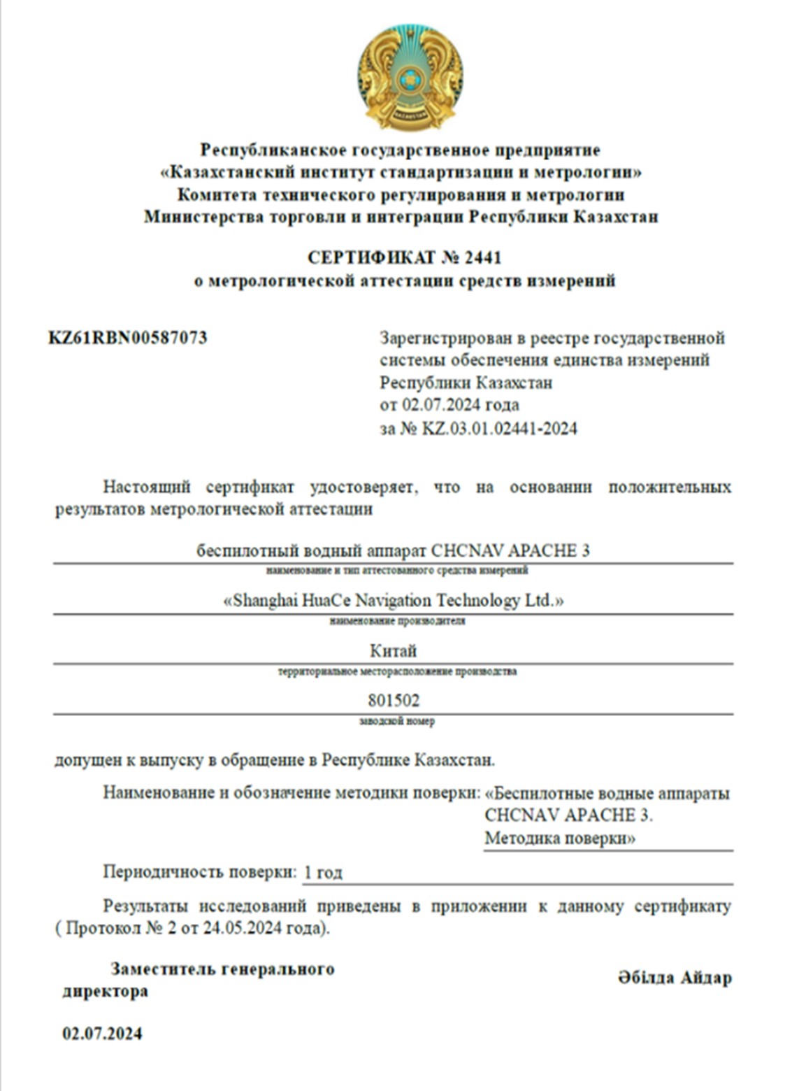 02.07.2024 г беспилотный водный аппарат СHCNAV APACHE 3 со встроенным эхолотом внесен в реестр Государственной системы обеспечения единства измерений Республики Казахстан (ГСОЕИ РК) в качестве средства измерений согласно СТ РК 2.30-2019 «ГСОЕИ РК. Порядок проведения метрологической аттестации средств измерений» с проведением первичной поверки в качестве средства измерений. Это позволяет использовать его в качестве высокоточного гидрологического средства измерений (рисунок 2).